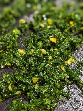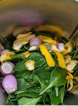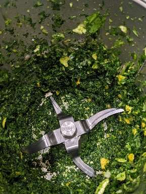2. Zitronenschale, Bärlauch, Knoblauch und Zwiebel in den Mixtopf geben, 5 Sek./Stufe 8 zerkleinern und mit dem Spatel nach unten schieben.