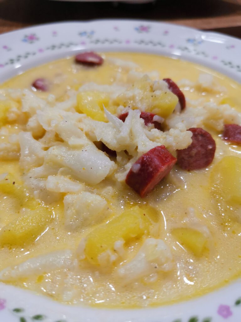 - Wasser, Blumenkohl, Kartoffeln, Gewürzpaste, Salz und Pfeffer zugeben und 20 Min./100°C//Stufe 1 garen.