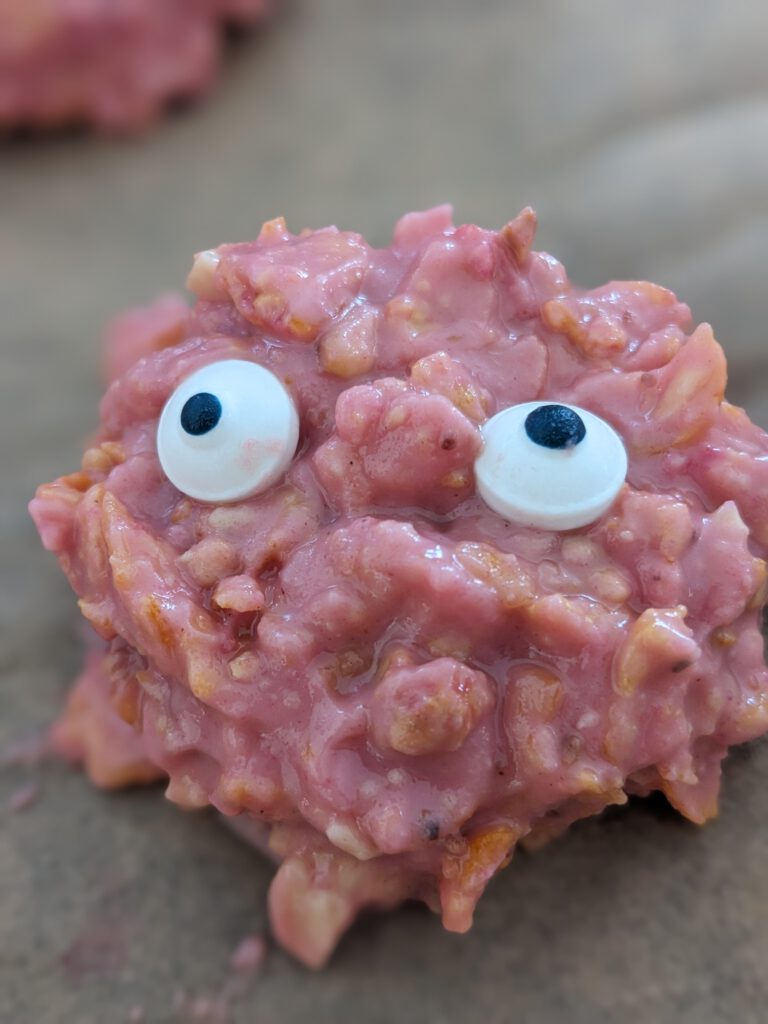 - Ein Brettchen mit Backpapier belegen. Mit 2 Teelöffeln 12 kleine Portionen daraufsetzen, jedes Crossie mit 2 Zuckeraugen verzieren und 1 Stunde im Kühlschrank fest werden lassen.