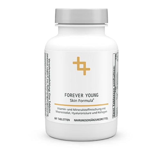 Forever Young Skin Formula-Tabletten enthalten eine sorgfältig ausgewählte Kombination aus wichtigen Vitaminen und Mineralstoffen zur Förderung eines gesunden Hautbilds.