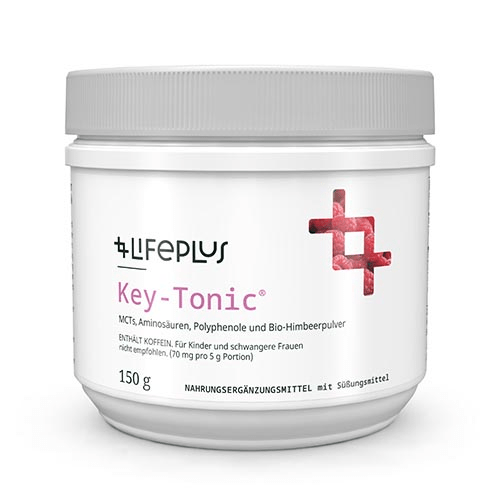 Key-Tonic ist eine ebenso einfache wie synergetische Kombination aus mittelkettigen Triglyceriden auf Kokosnussbasis mit einem hohen Anteil an C-8 MCT, essenziellen Aminosäuren, pflanzlichen Polyphenolen, dem Koffeinanteil etwa einer Tasse Kaffee und einer Prise hochbioverfügbarem B12, abgerundet mit gefriergetrocknetem Himbeerpulver und Stevia. Die Synergie ist das Besondere an dieser Kombination, doch jeder der Inhaltsstoffe bietet auch seine eigenen Vorteile.
