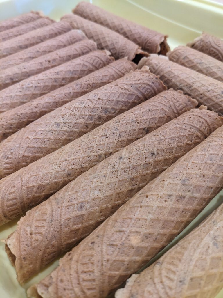 Am nächsten Tag Neujahrskuchen im Hörncheneisen backen. Evtl. den Teig mit etwas Wasser verdünnen.