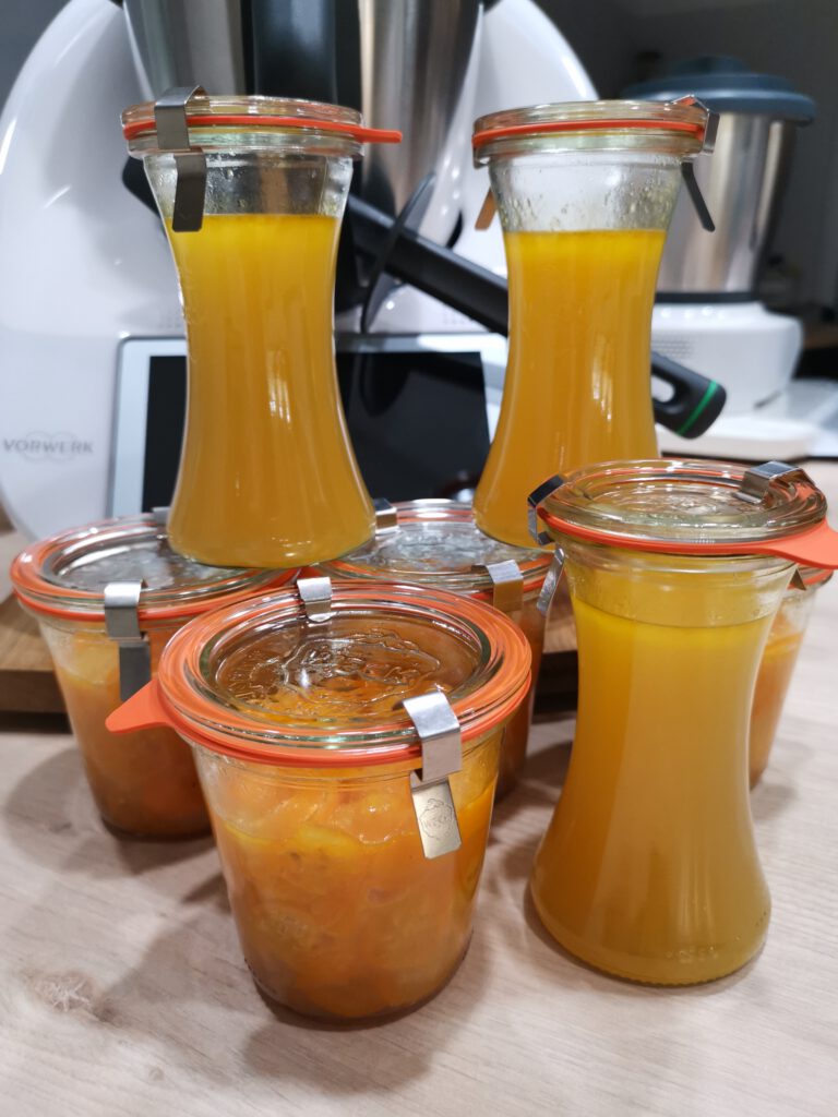 - 800 g Wasser in den Mixtopf geben, Varoma-Behälter aufsetzen, verschlossene Rexgläser hineinstellen, Varoma verschließen und 45 Min./Varoma/Stufe 1 einkochen. Varoma abnehmen und zur Seite stellen. Gläser komplett auskühlen lassen (siehe Tipp) und danach die Klammern entfernen.