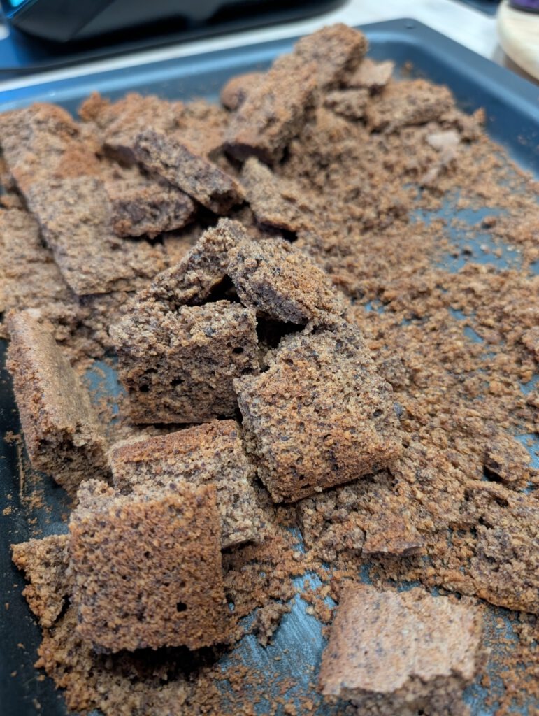 6. Backofen auf 180°C vorheizen. Den Teig gleichmäßig auf das Blech verteilen und für 15-20 Minuten backen. Auskühlen lassen, in Stücke schneiden und 1-3 Tage trocknen Dann die Stücke in den TM geben und bei Stufe 4 ein paar Sekunden zerkleinern. Nehmt erstmal nur 5 Sekunden. Kleiner geht immer, wenn ihr die Zeit verlängert.