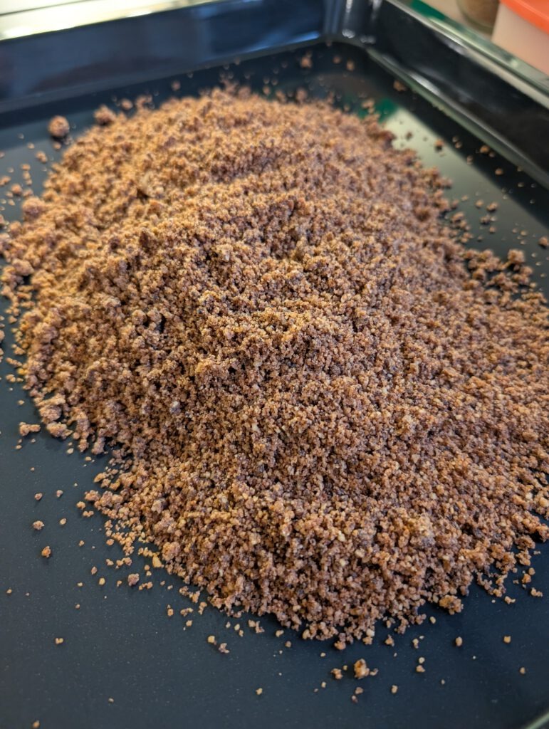 6. Backofen auf 180°C vorheizen. Den Teig gleichmäßig auf das Blech verteilen und für 15-20 Minuten backen. Auskühlen lassen, in Stücke schneiden und 1-3 Tage trocknen Dann die Stücke in den TM geben und bei Stufe 4 ein paar Sekunden zerkleinern. Nehmt erstmal nur 5 Sekunden. Kleiner geht immer, wenn ihr die Zeit verlängert.