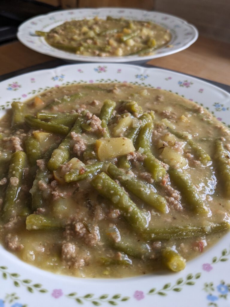 - Schnippelbohnen-Eintopf abschmecken und servieren.