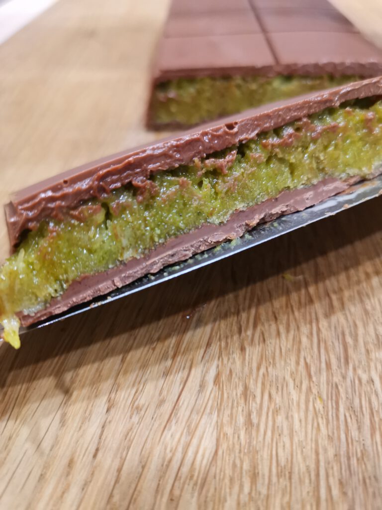 - Teigfäden unter Zugabe von Butter in einer Pfanne auf dem Herd anbraten. Tahin und Pistaziencreme zugeben, vom Herd nehmen und vermischen, bis eine homogene Mischung entsteht. Teigfäden-Mischung in der Schokoladenform verteilen, mit ½ geschmolzenen Schokolade bedecken (siehe Tipp), ca. 1 Stunde in das Gefrierfach legen und Servieren oder bis zum Servieren im Kühlschrank aufbewahren.