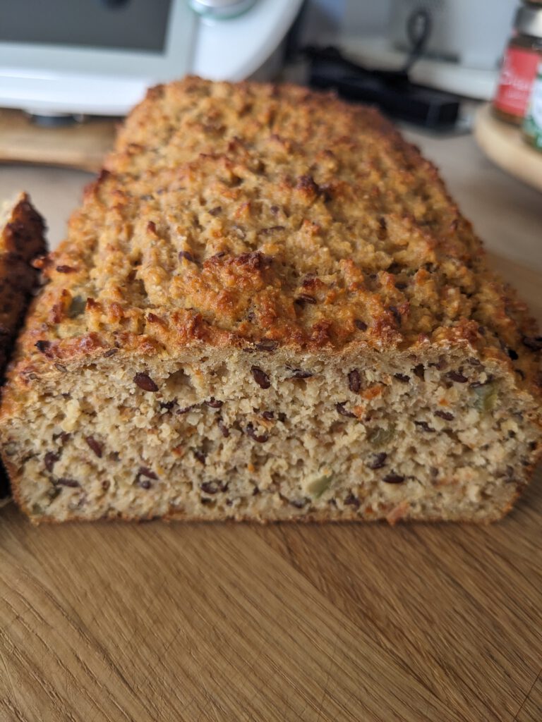 3. Dinkelflocken, Haferkleie, Magerquark, Backpulver, Eier, Leinsamen, Salz und Oliven zugeben, Teig Stufe/1 Min. 30 Sek. kneten.